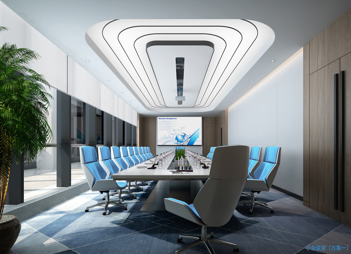 會議室裝修比較虛幻,主要就是頂面造型配上燈光和會議室的聲學設計。地面選擇地毯。墻體不做過多的造型 ,只做燈光點綴,不讓空間顯得單調。