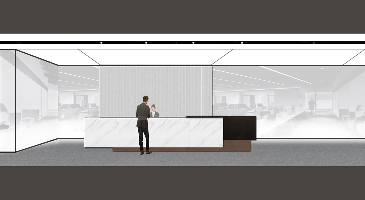 前臺(tái)設(shè)計(jì)相對(duì)簡(jiǎn)單,形象墻采用淺色飾面板,簡(jiǎn)潔,大方。爵士白大理石與黑胡桃飾面板拼接成的吧臺(tái),黑白相間更加體現(xiàn)企業(yè)穩(wěn)重之感。
