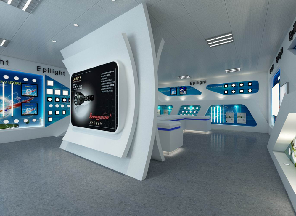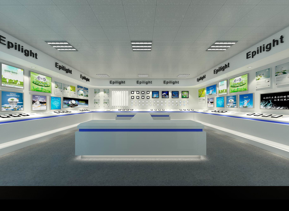 本案品牌產(chǎn)品為節(jié)能LED。整體基調(diào)是經(jīng)典的科技藍,顯得高端科技新。墻面的造型趨于簡潔干凈,通過文案與組合掛畫,豐富與提升空間氛圍,文案與物料掛板也是經(jīng)過設(shè)計師精心設(shè)計,裝飾品味與銷售功能無縫結(jié)合。