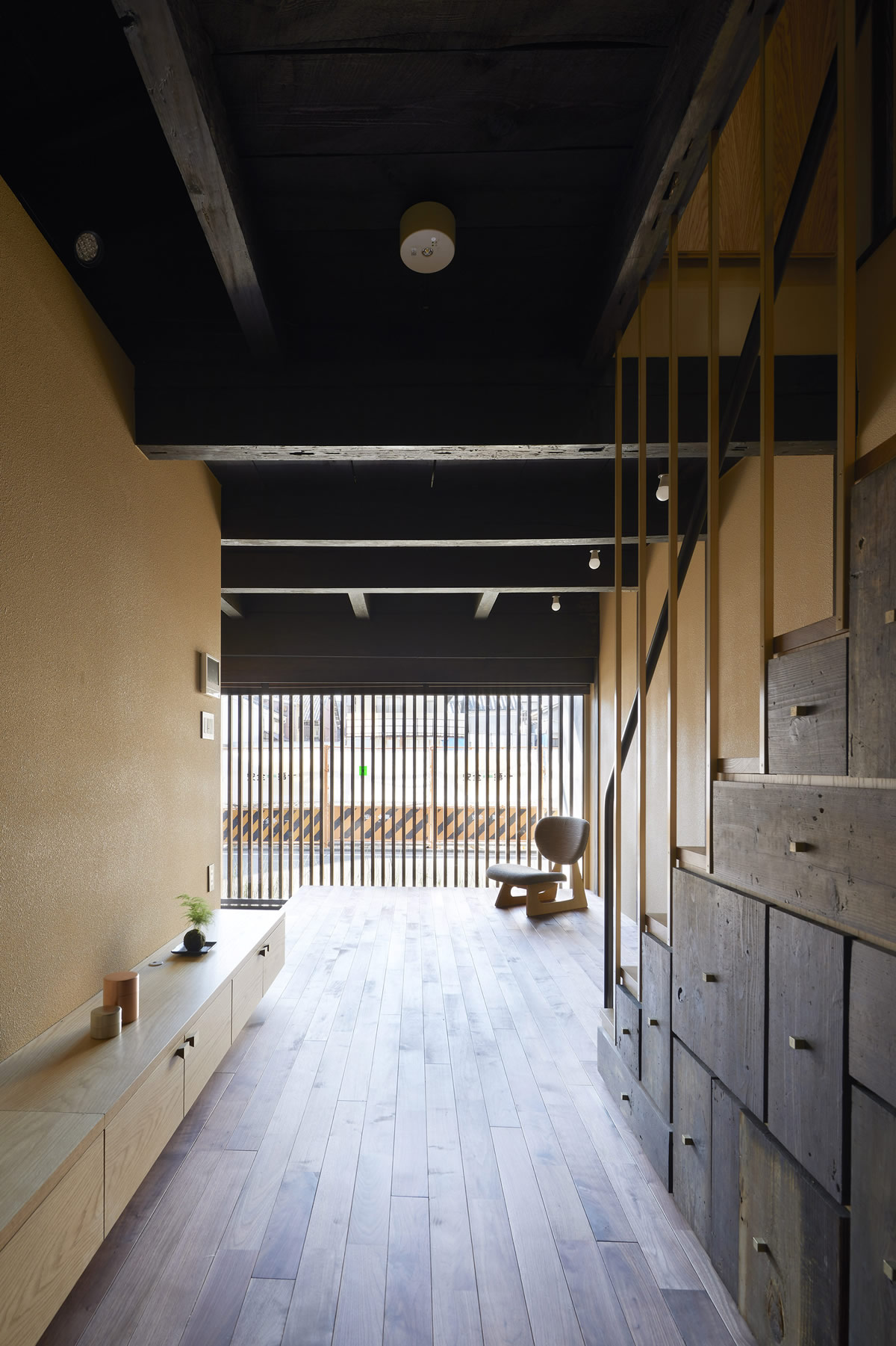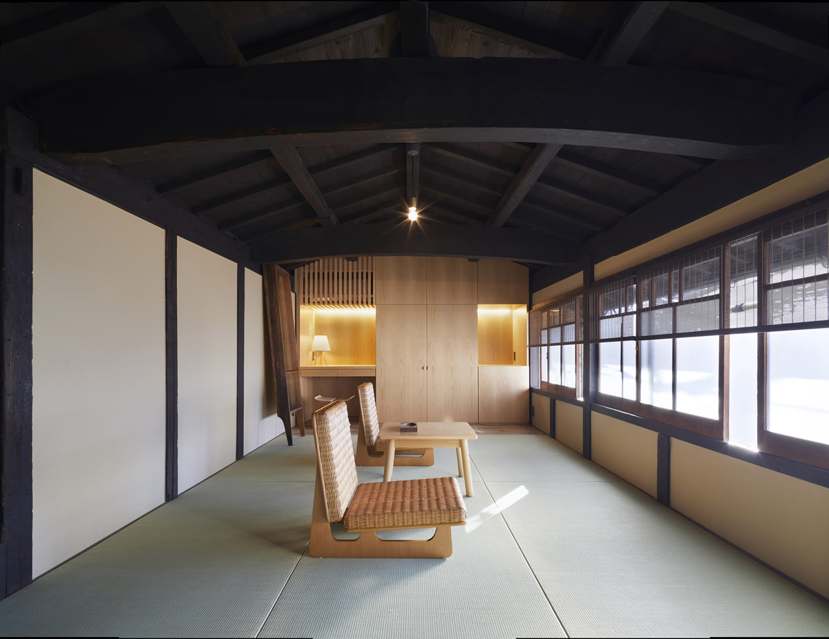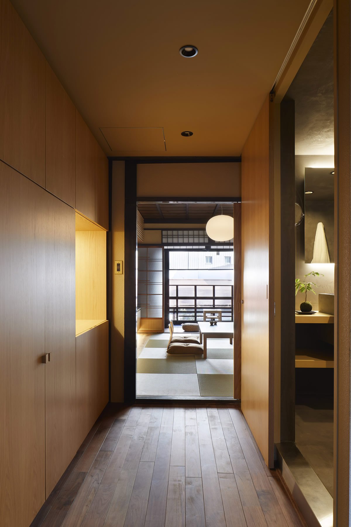 正面上設(shè)計插入了一個隧道的純粹現(xiàn)代空間作為主入口,向外伸出主體,向內(nèi)穿過主體直入深處的庭院,使得來往行人路過時便能看到深處的庭院景觀,這便是新場景的開始,旨在表達傳統(tǒng)生活文化的精髓——庭院。這個隧道除了連接民宿和茶室、庭院等各空間外,同時作為展示空間,展示淘來的各種老物件,供住戶參觀展示提供一個干凈的背景。