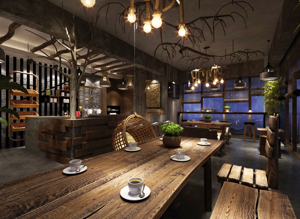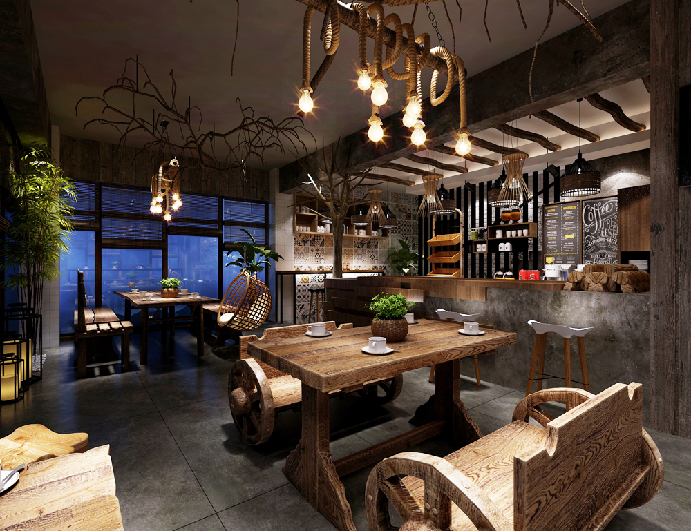 保留原頂面設(shè)計,不做其它裝飾,增加空間的寬闊感。吧臺空間采用水泥加上老木頭裝飾板,給人一種年代感。麻繩燈具利用廢舊的樹枝加以裝飾,使得整個空間更加貼近自然。