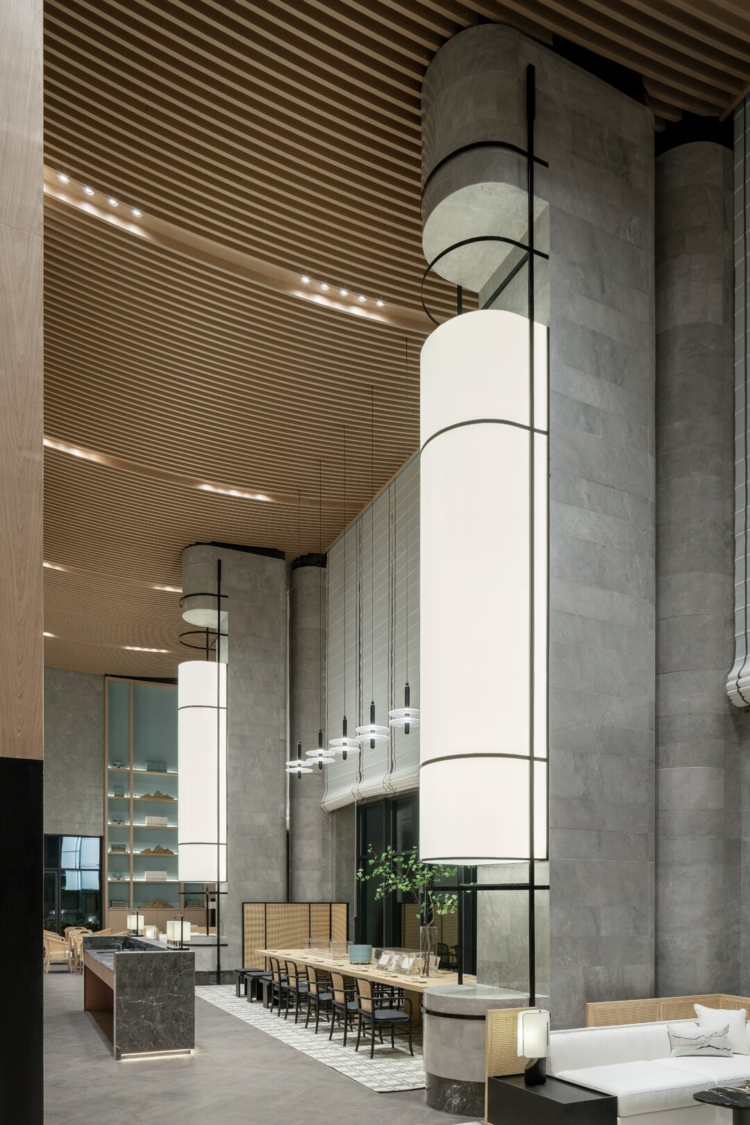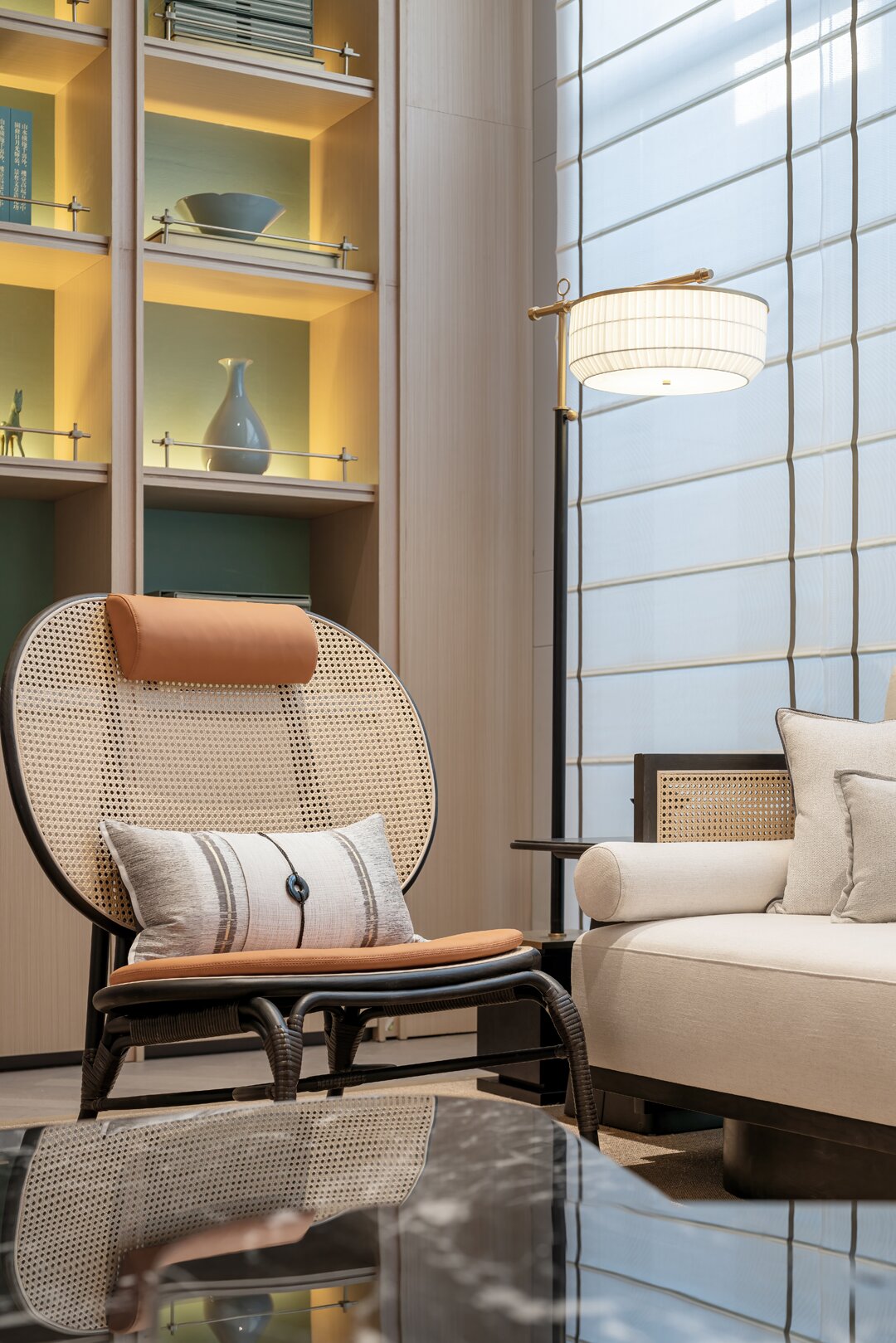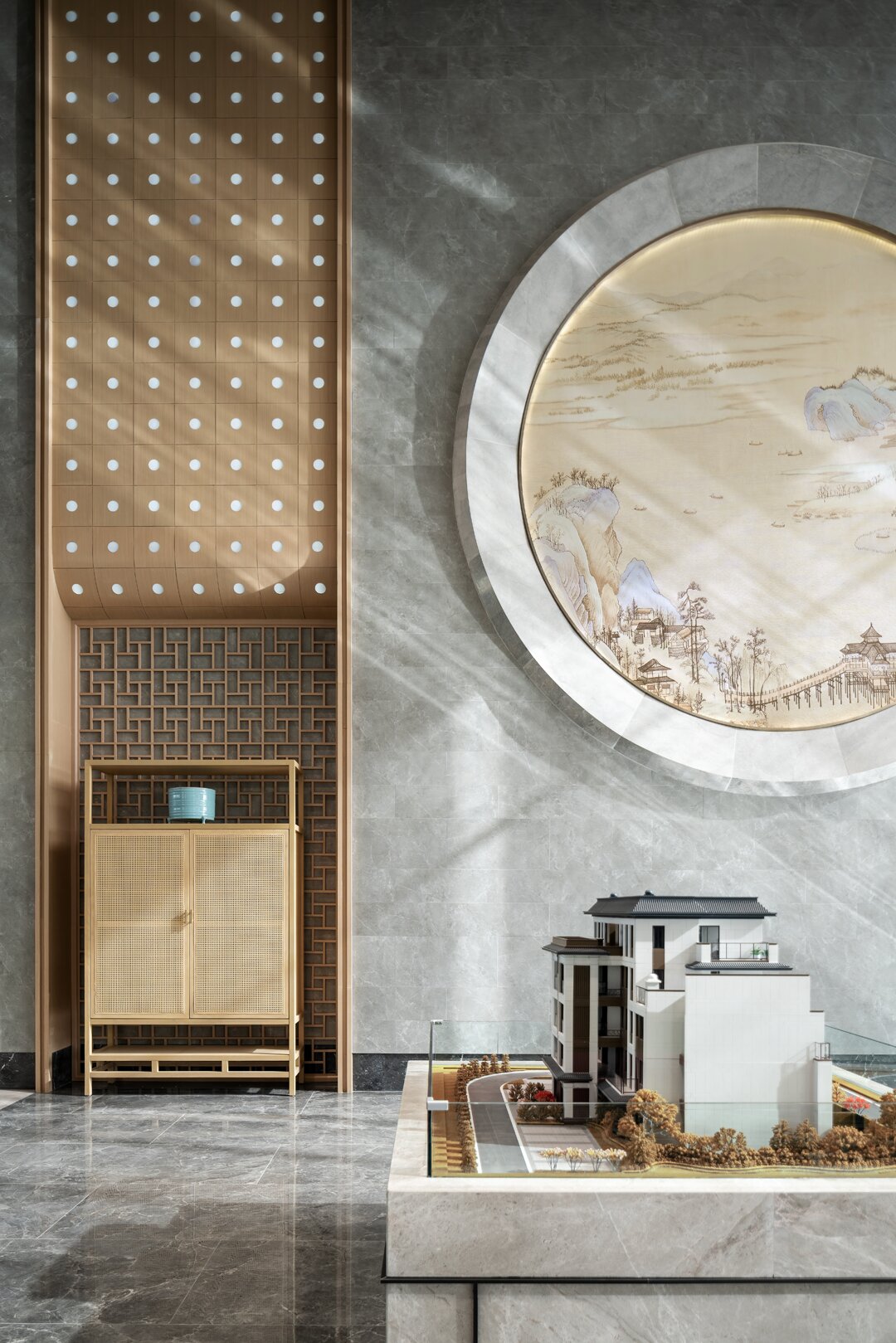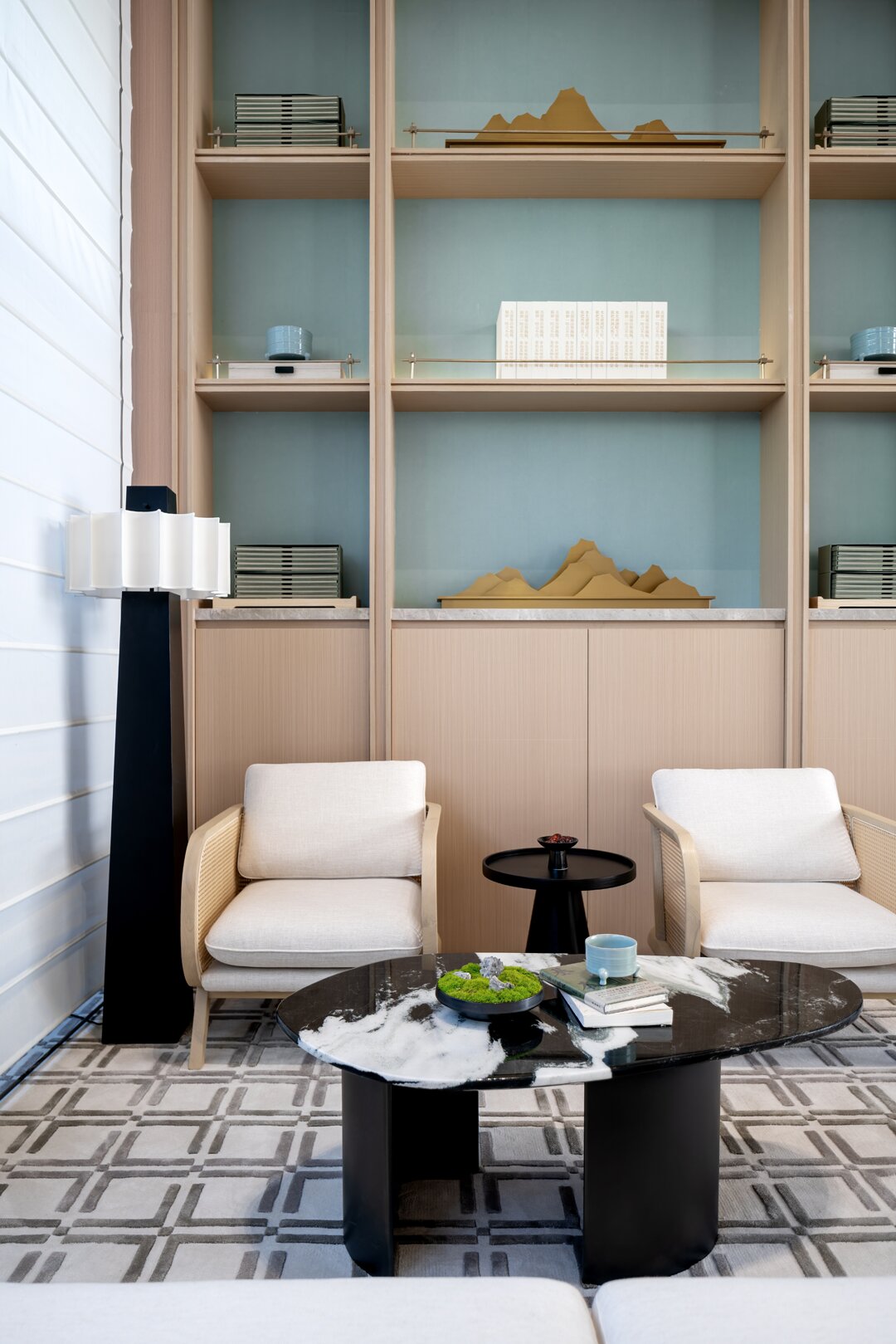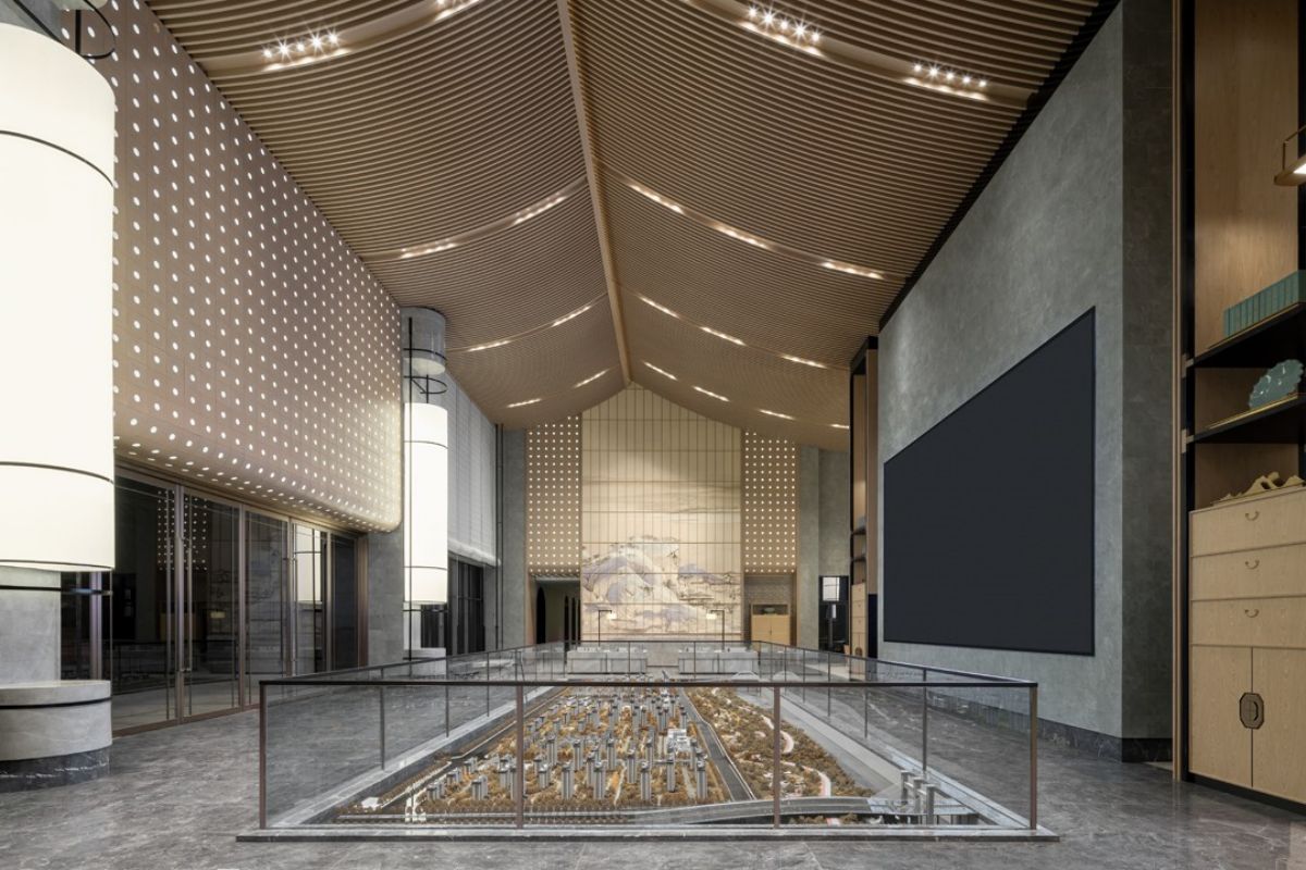 沙盤(pán)區(qū)域以素雅的木材柔和石材的自然紋理,展現(xiàn)空間簡(jiǎn)潔精致的同時(shí),結(jié)合屏風(fēng)中式鏤空線條及藝術(shù)擺置營(yíng)造出東方的意境之美。