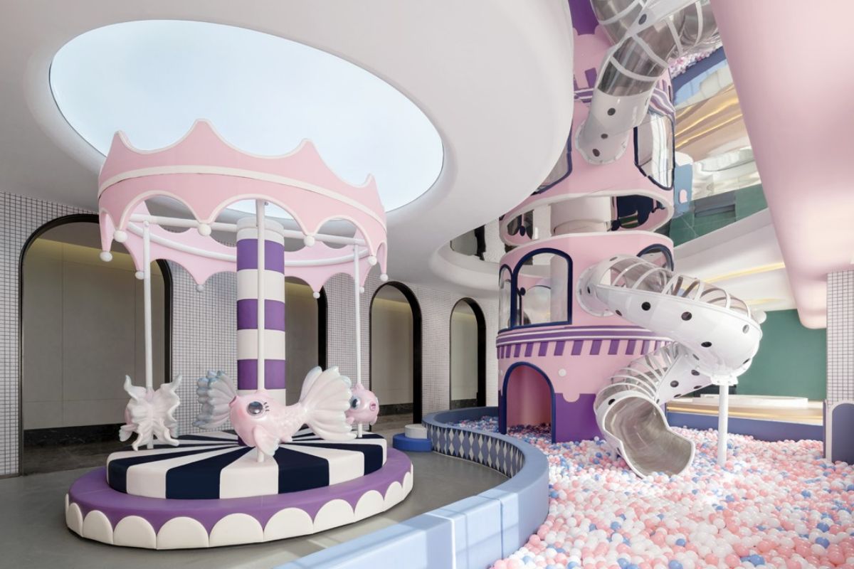 兒童娛樂(lè)區(qū)占據(jù)一角,自然光帶來(lái)了令所有生命躍動(dòng)的能量,再添上天空和公主粉的顏色。墻上純白的馬賽克,就連成年人也忍不住去玩上一玩 ,頂面鏡面的使用,使一高一矮的兩個(gè)“小朋友”共同拼湊出美好的藝術(shù)。