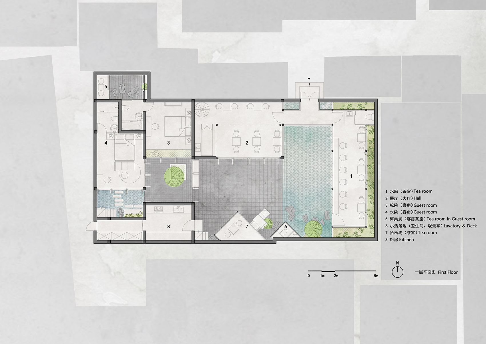 中國人,崇尚中庸之道,所謂中庸,是一種折中調和的處世態(tài)度??傆X得,茶道和中庸之道有不謀而合之處,茶烘焙的火候要不高不低,斟茶要七分滿,以茶待客要謙恭、平和。在茶室的設計上,中庸之道同樣適用,不能寒酸,更不宜奢華,介于之間,不偏不倚,便是最佳。