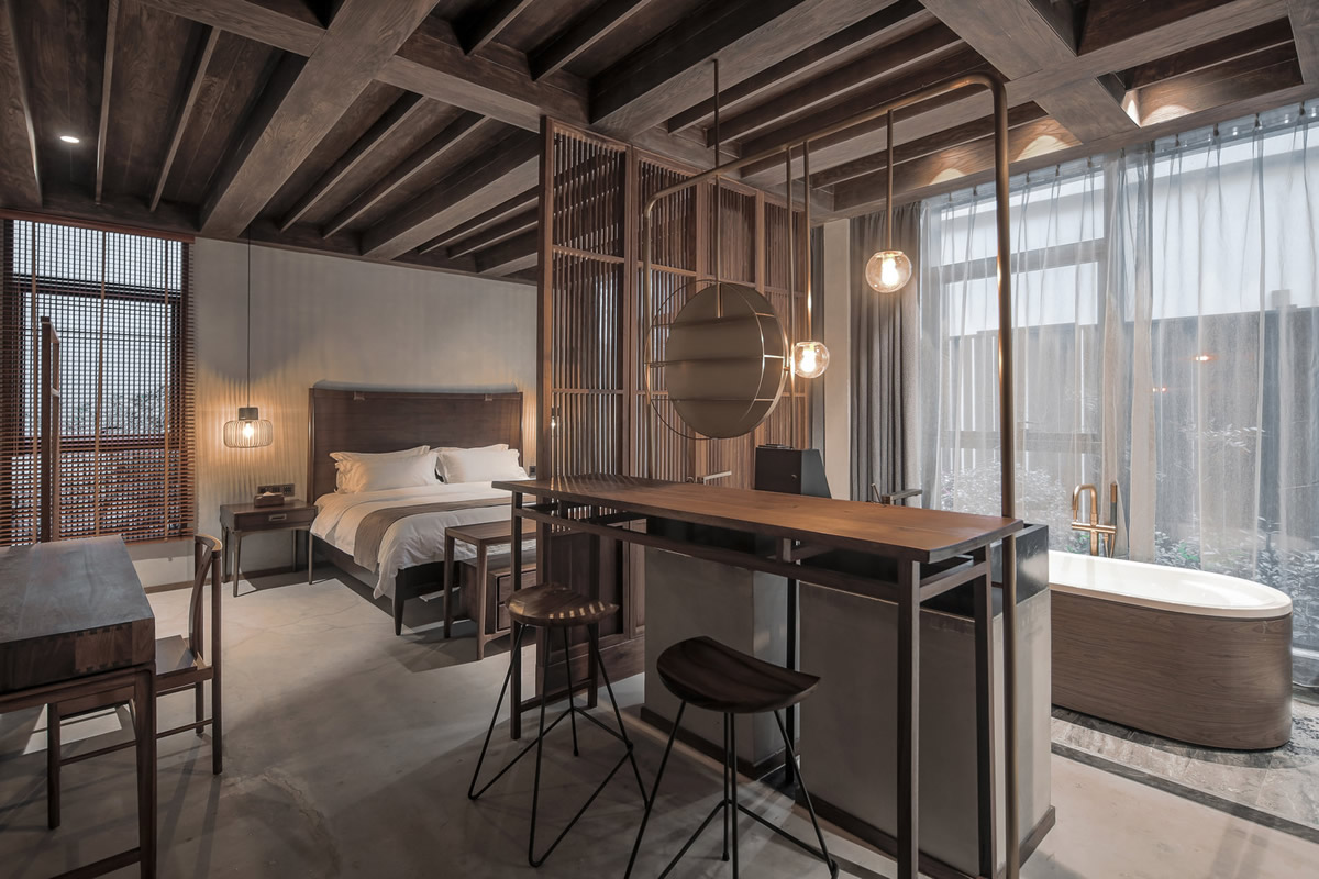※在新中式風(fēng)格民宿改造設(shè)計過程中,采用簡化的手法來體現(xiàn)中國傳統(tǒng)文化內(nèi)涵,古代“鏡”原以銅或鐵鑄,現(xiàn)代設(shè)計師喜歡采用未經(jīng)過度加工的銅料與圓形鏡面組合,要勾勒生活品質(zhì),一個足以。簡約梳妝臺遇見陶瓷大浴缸,木藝遇見鐵藝,厚重的銅鏡遇到琉璃玻璃窗,現(xiàn)代化設(shè)施遇到別出心裁的設(shè)計。