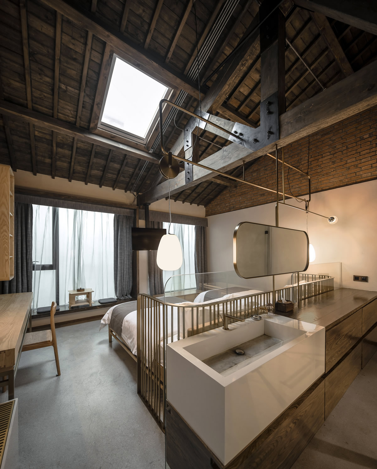 ※民宿客房在朝南的主樓,樓內(nèi)空間功能分區(qū)布局巧妙,恰到好處。中庭,將樓道空間與露臺以及后院全部打通,達到視線與空間的最大程度的開放。玻璃天窗保證了客房公共區(qū)域的采光需求,一改老舊房屋的昏暗,銅質(zhì)和實木相結(jié)合的樓梯承上啟下。陽光照進天窗,輾轉(zhuǎn)映射在二樓白墻,透過挑空的中庭玻璃棧道照射到一樓水磨石地面,整個空間一氣呵成,顯得更加充沛明亮。