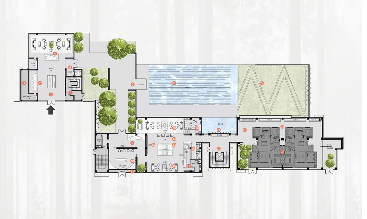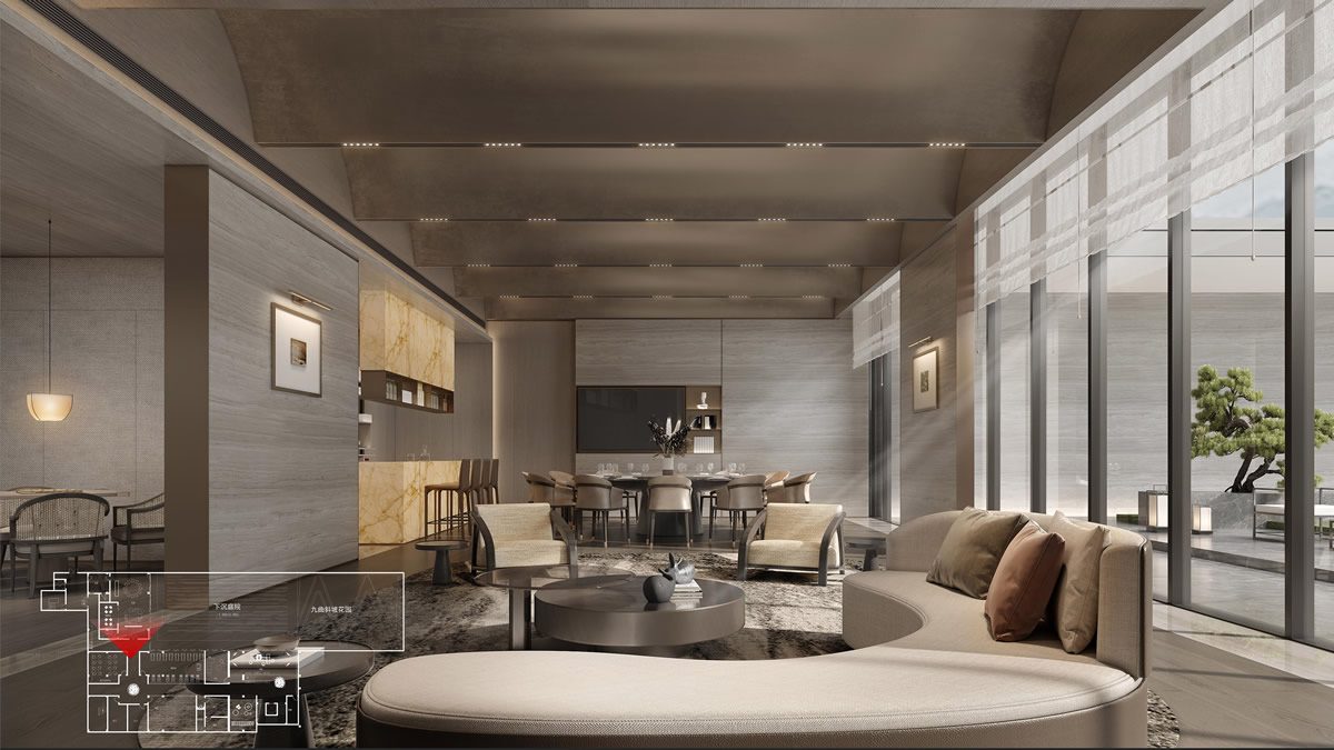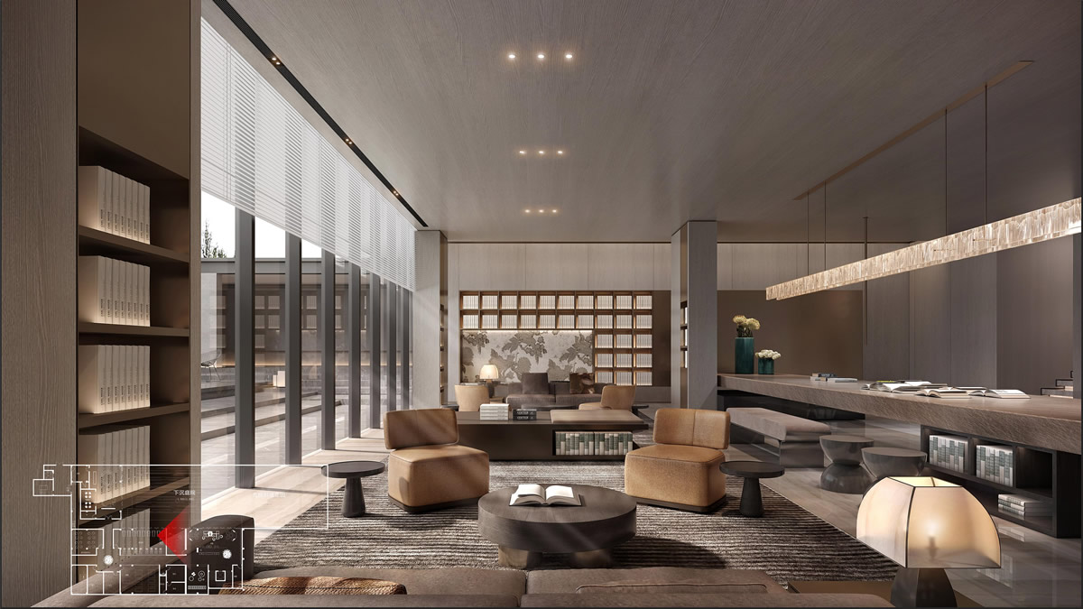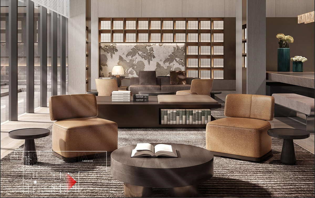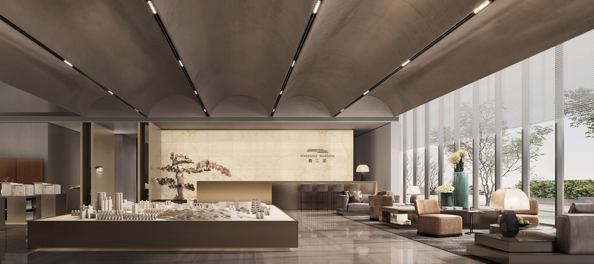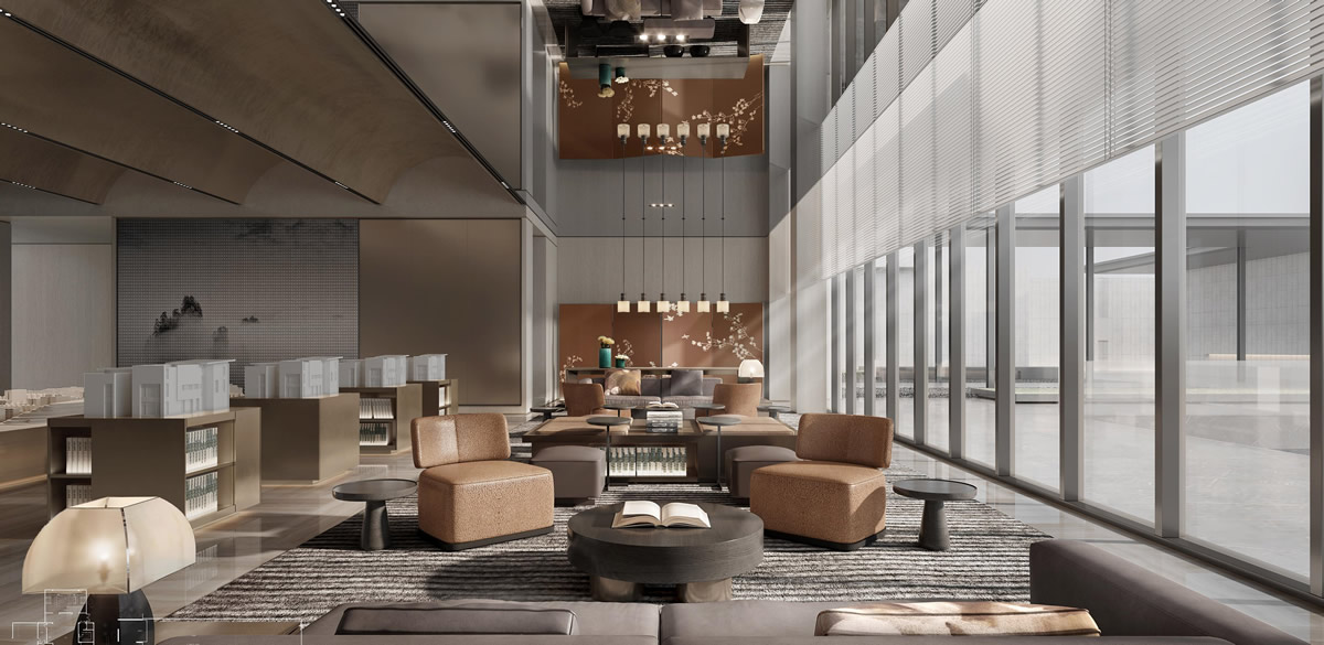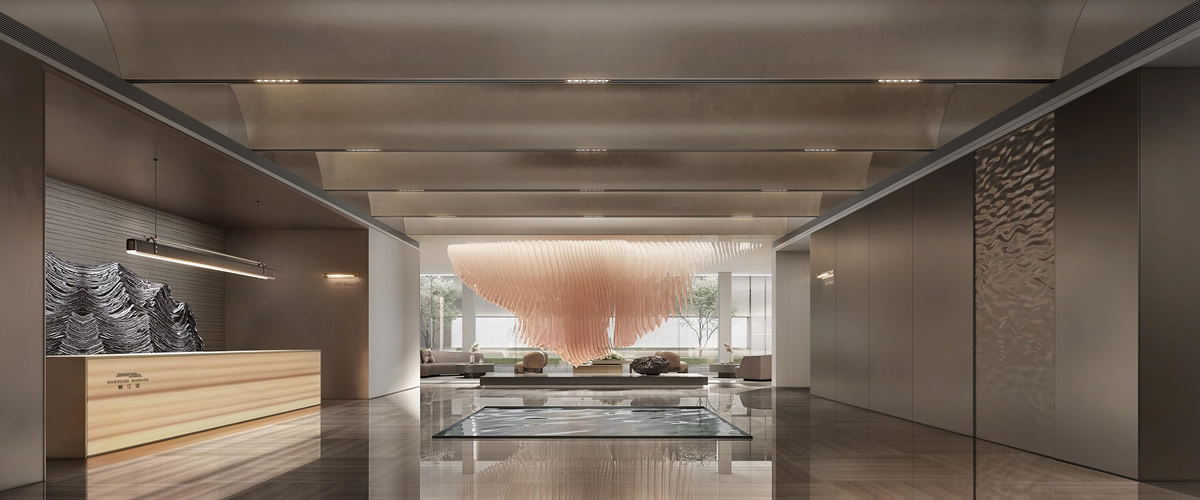 接待前廳采用塊面式裝飾手法表達,并運用不同的肌理材質(zhì)豐富空間的層次感,同時融入自然元素,讓客戶在步入空間時感受到藝術(shù)與自然品質(zhì)和諧共存。