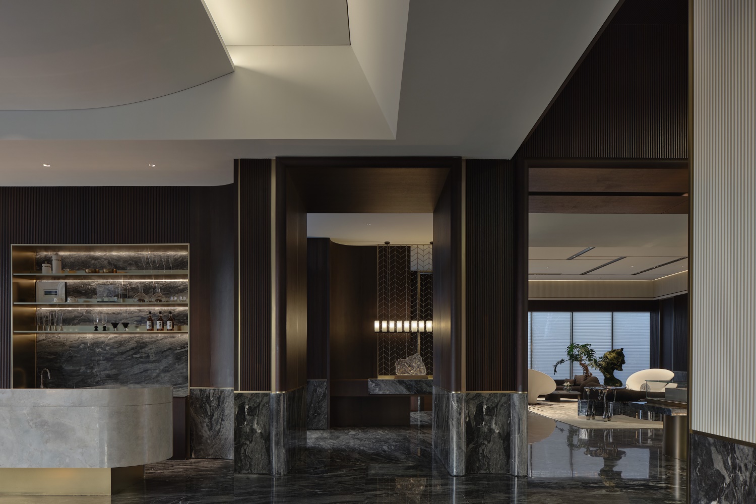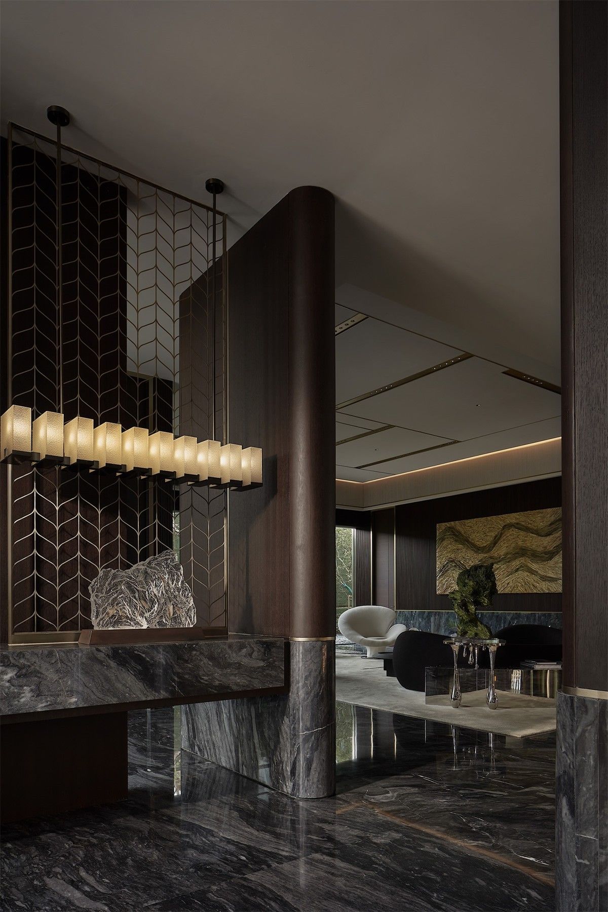 在中國傳統(tǒng)意識當(dāng)中,一望無際的通透從來都不是主流審美。一道屏風(fēng),不止分隔空間功能,更是讓室內(nèi)景致有節(jié)奏的映入眼簾。