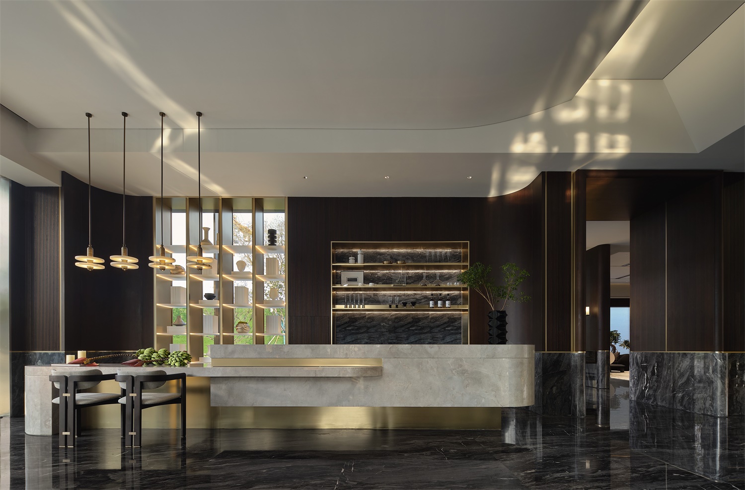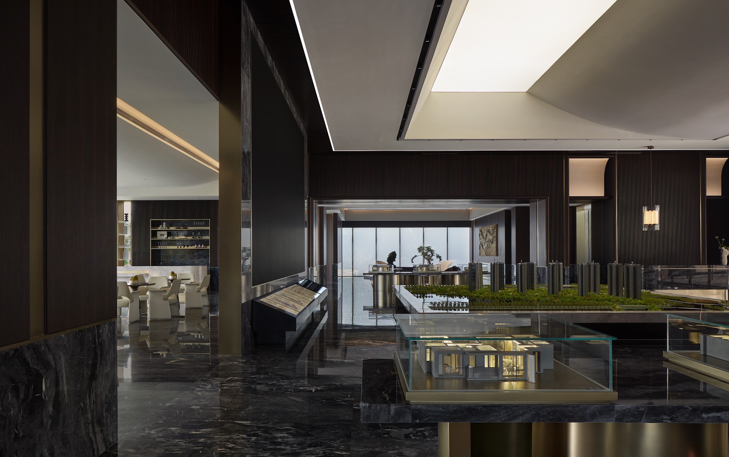 洽談休閑區(qū)落地大玻璃的應(yīng)用,這樣的空間鏈接才能讓顧客感到樓盤的智能化。同時玻璃外的景物及波光粼粼的水面,更能使空間加入一些動態(tài)的元素,以起到動態(tài)與靜態(tài)的交融,整體氣氛給交流溝通提供良好的環(huán)境。