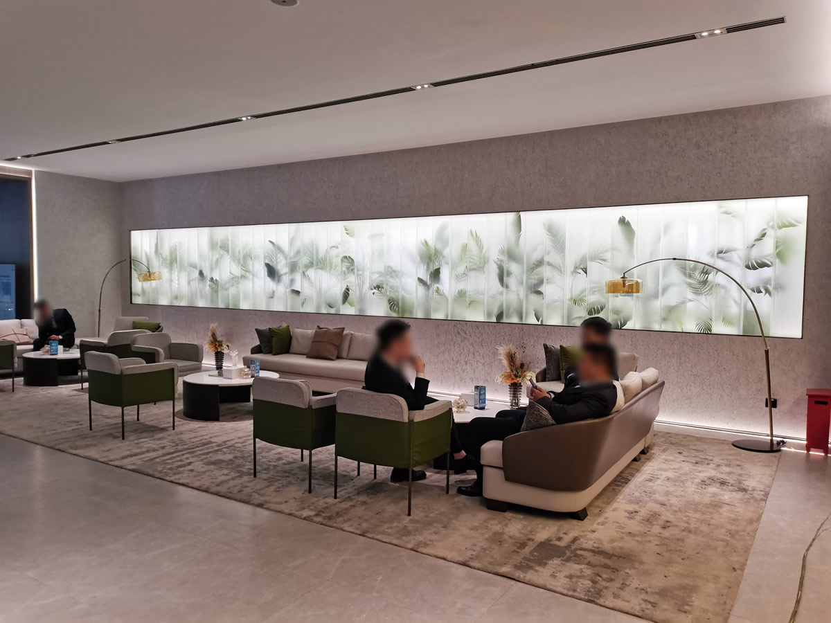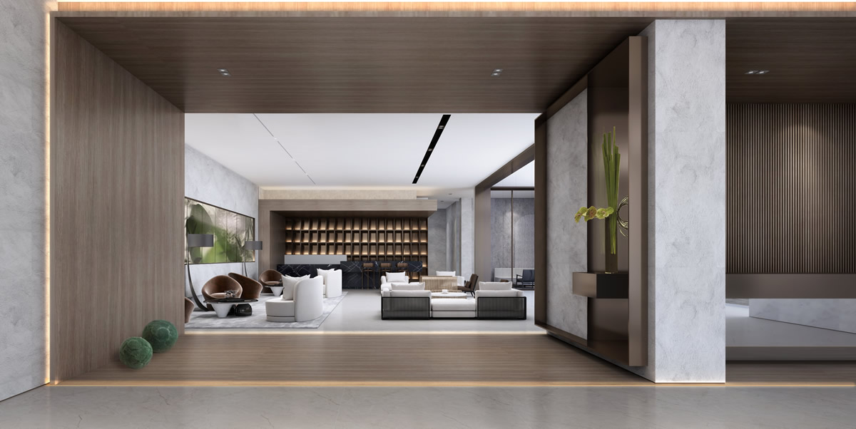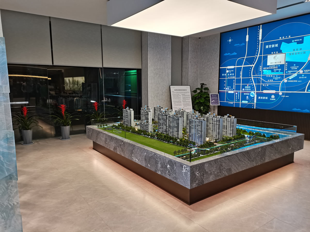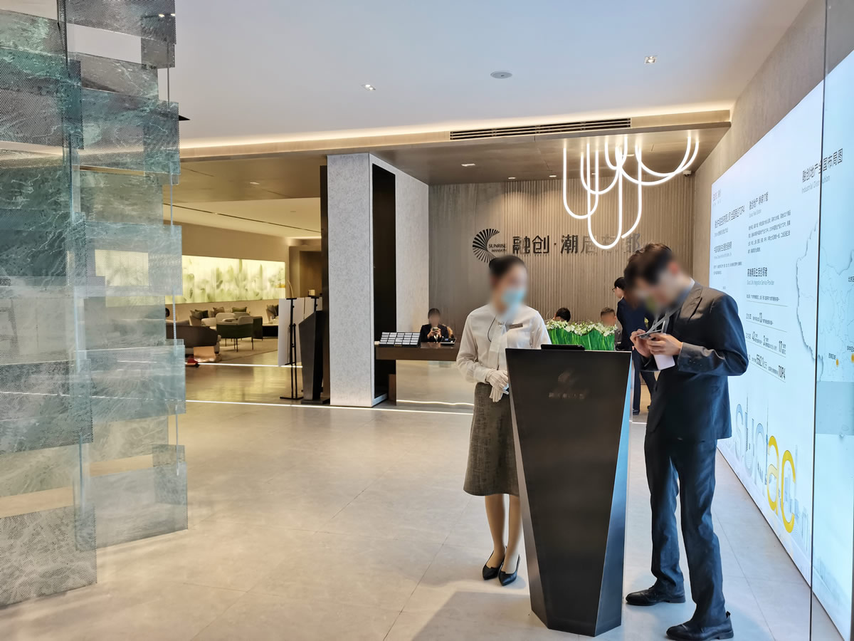 環(huán)湖而立,依水而起。水起水落,行云流水。此處為亞克力水波紋屏風(fēng),呼應(yīng)了開發(fā)商靠潘安湖景觀房的要求,且給人汪洋大海的感覺。