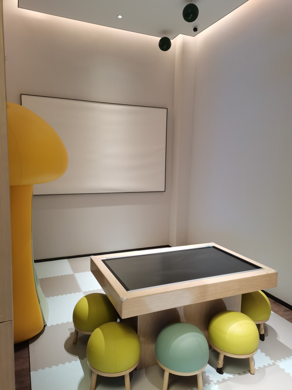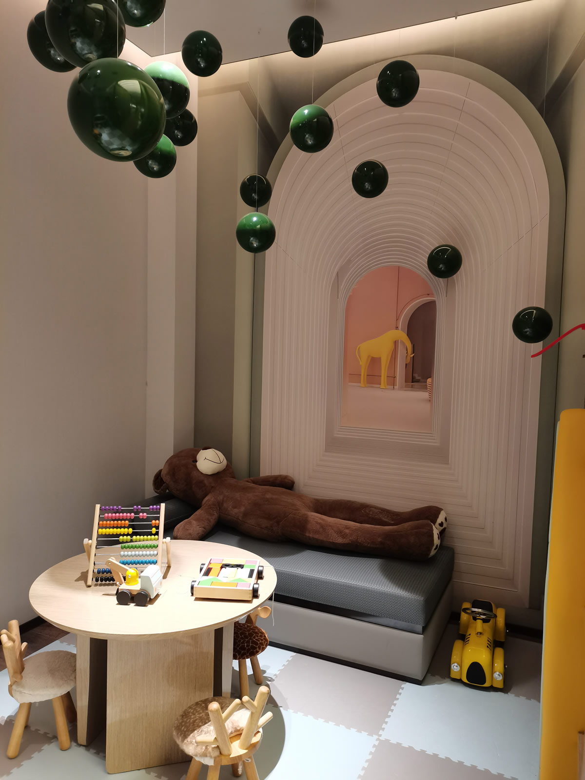 兒童活動(dòng)區(qū)是一片鮮艷的繽紛海洋,從沙發(fā)揮灑至地毯,色彩布局一氣呵成。